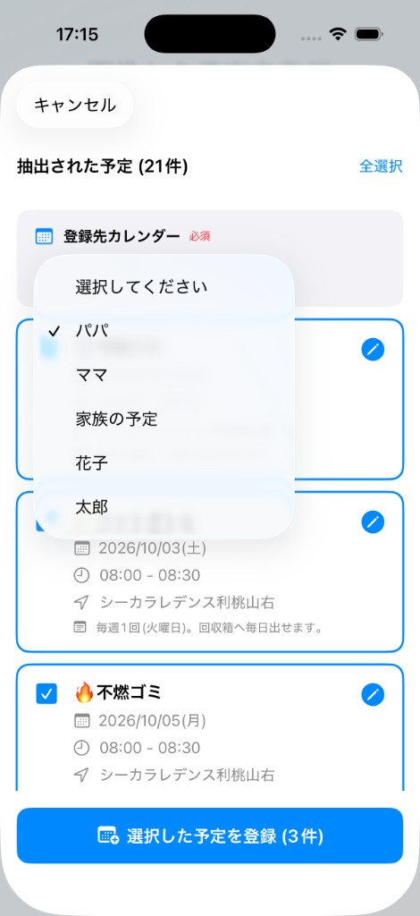 画像は予定抽出後すぐに削除され、サーバーに保存されません。氏名や住所などの個人情報は意図的に抽出しない設計です。 Images are deleted right after extraction and are not stored. We don’t extract names or addresses.