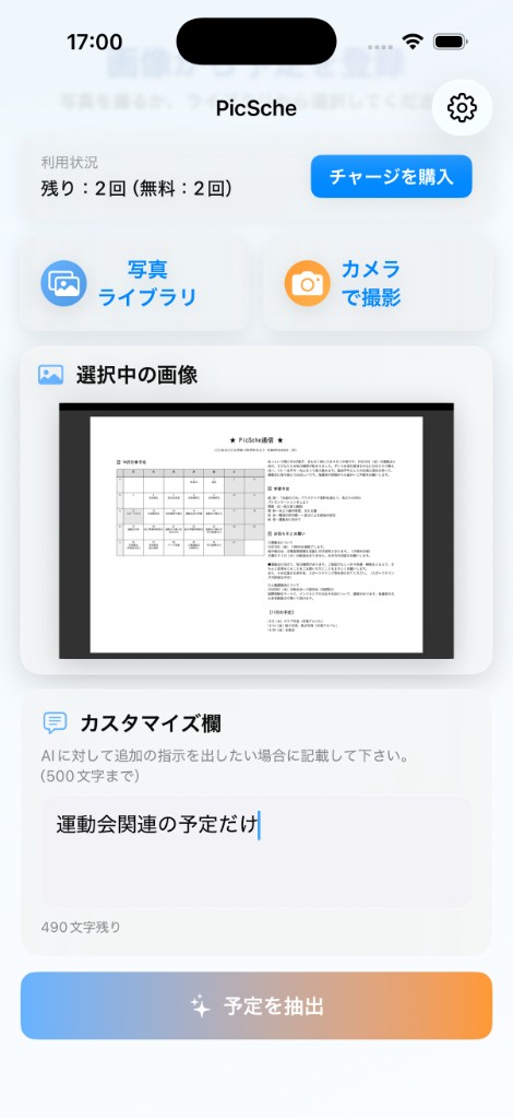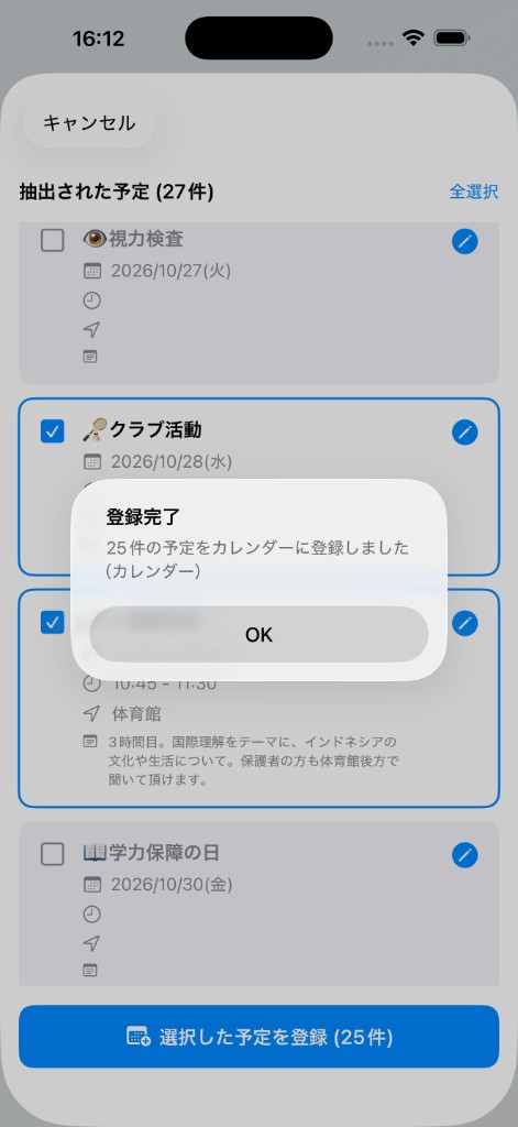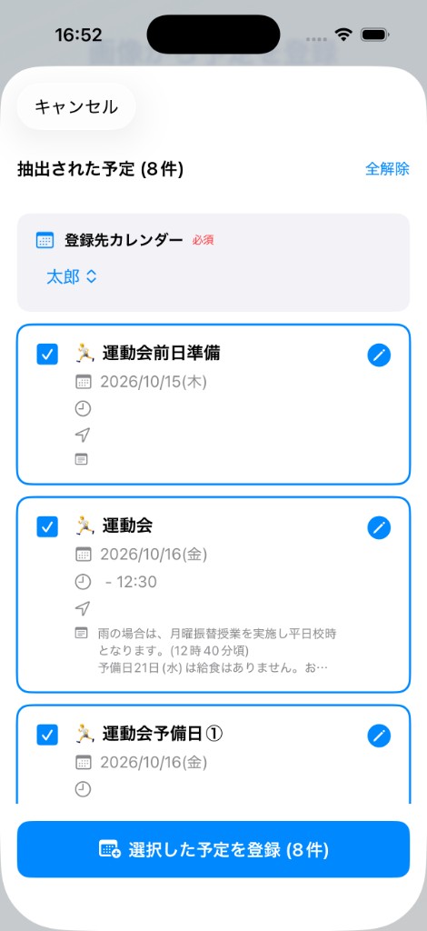 一部の予定だけが欲しいのに。。なんて時は、「運動会関連の予定だけ」など追加の依頼をカスタマイズ欄に記載すれば、AIがあなたの依頼に答えて、抽出結果をカスタマイズします。 When you only want some of the events, add instructions like “Only sports day events” in the customize field and the AI will tailor the extraction results to your request.