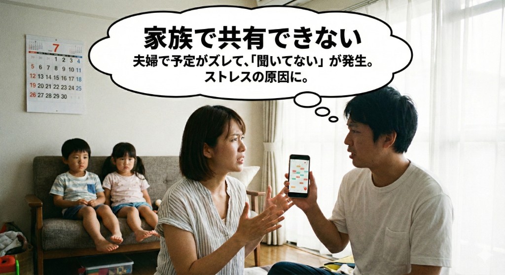 夫婦で予定がズレて、「聞いてない」が発生。ストレスの原因に。 Schedules get out of sync and “I didn’t know” causes stress.