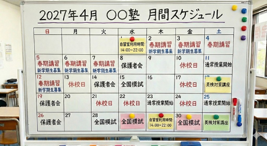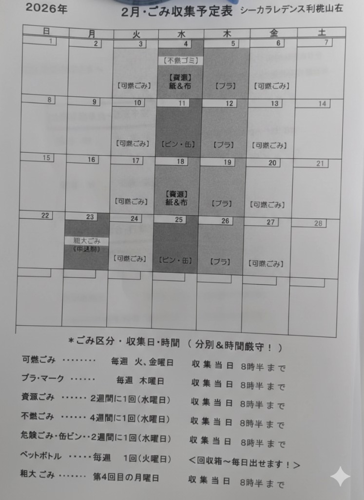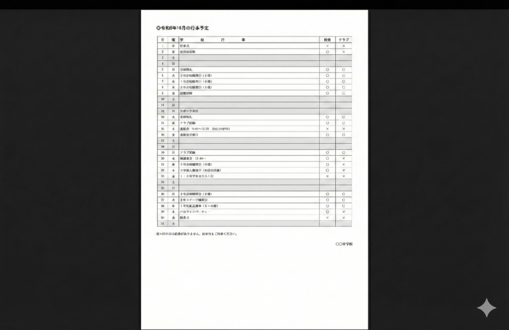 学校からのお便り、月間カレンダー、習い事のスケジュール、イベントチラシ、ゴミ出しカレンダー、手書きの予定表など、幅広い画像に対応しています。 School flyers, monthly calendars, lesson schedules, event flyers, recycling calendars, handwritten plans, and more.